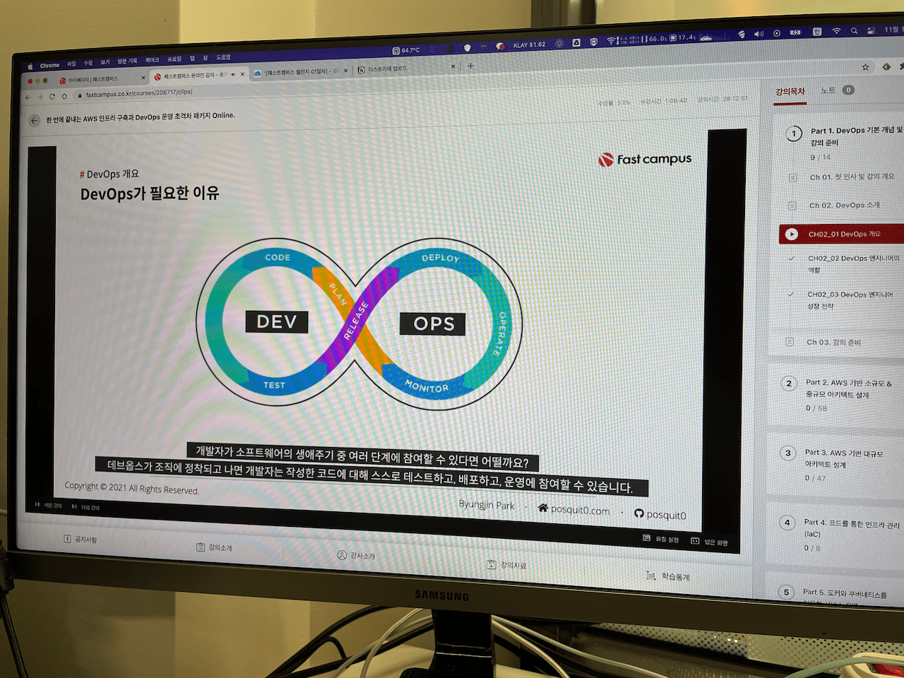 제가 패스트캠퍼스에서 신청한 강의는 현업에서 Software, DevOps, Cloud 엔지니어로 활동하는 분들이 AWS 인프라를 구축하고 DevOps를 운영을 알려주는 강의입니다.