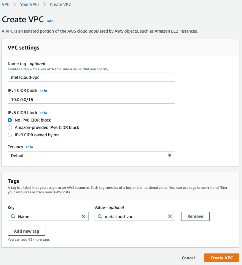 - 신규 VPC를 10.0.0.0/16 대역으로 VPC를 생성합니다.