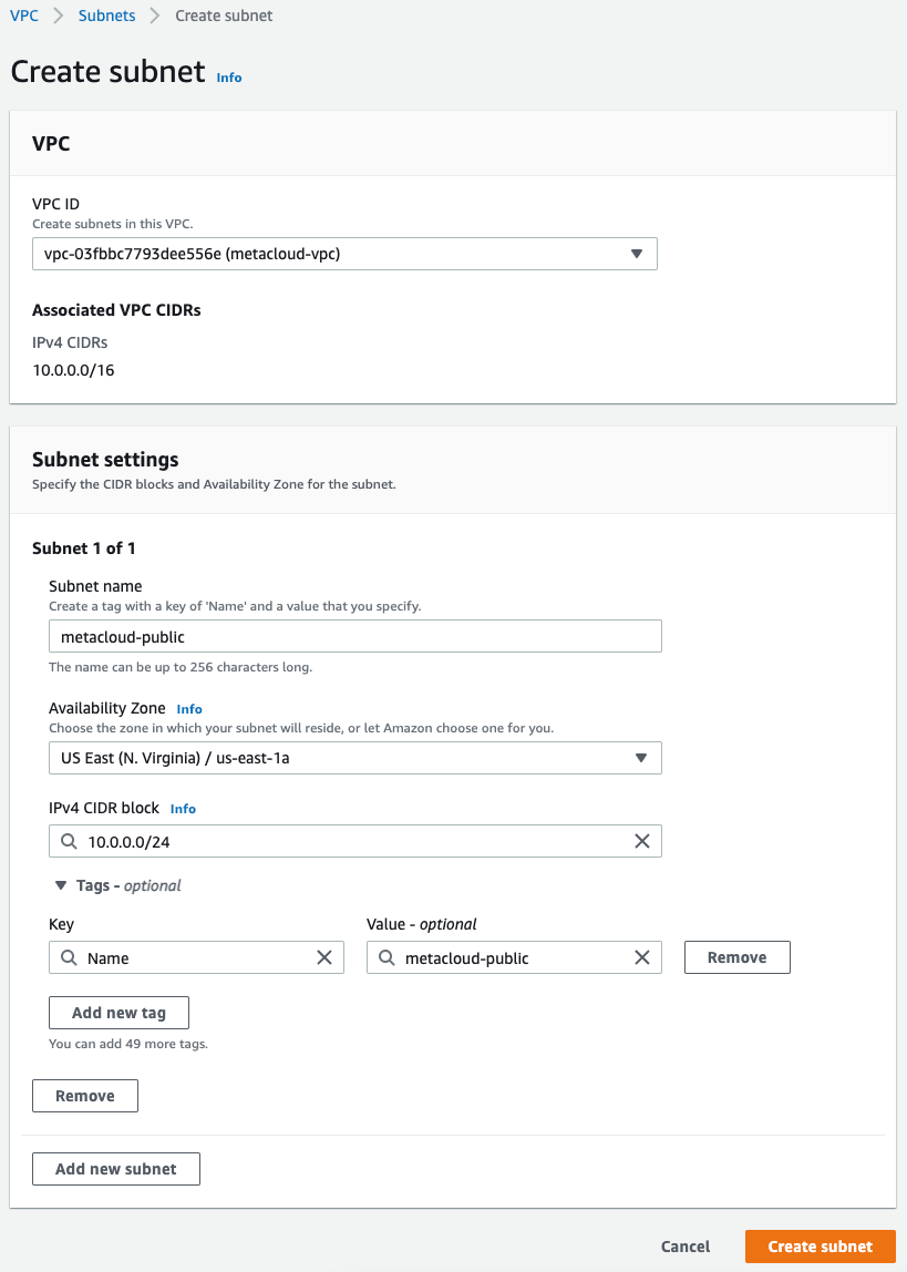 - 생성한 VPC를 선택하고 Public Subnet으로 사용할 Subnet을 10.0.0.0/24로 생성합니다.