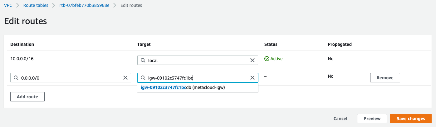 - Public Subnet의 라우팅 테이블에서 Internet Gateway로 통신할 수 있도록 라우팅 경로를 지정합니다.