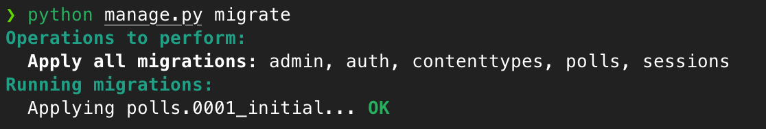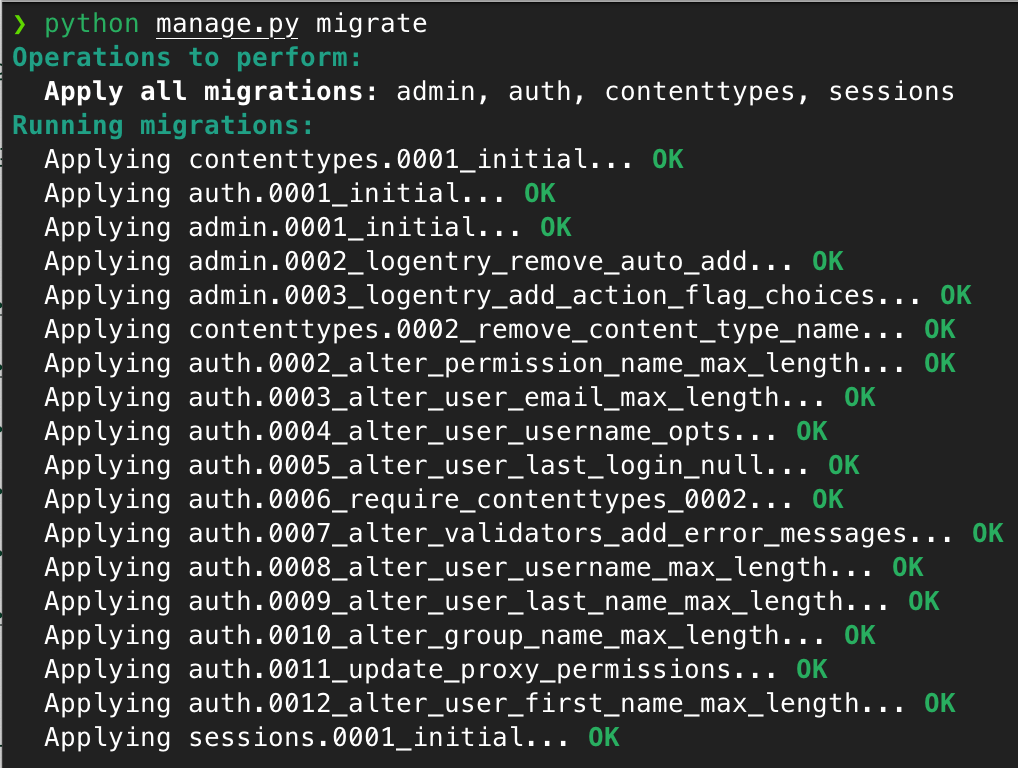 그리고 아래 명령어를 입력하면 db.sqlite3 파일이 생기는데 models.py에서 정의한 데이터베이스가 생성된 것입니다. 예전에는 쿼리문을 날려서 데이터베이스를 생성했지만 Django에서는 코드를 통해 데이터베이스를 만들 수 있습니다.
