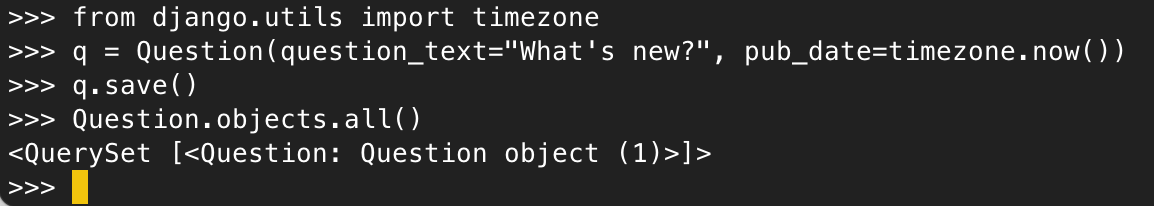 >>> q = Question(question_text="What's new?", pub_date=timezone.now())