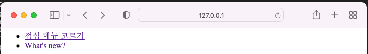 이전과 다르게 질문이 텍스트에서 하이퍼링크로 달리고 리스트 형태로 출력됨을 확인 할 수 있습니다. 질문이 2개 였기 때문에 index.html의 for문이 두바퀴 돈거라고 이해하시면 됩니다.
