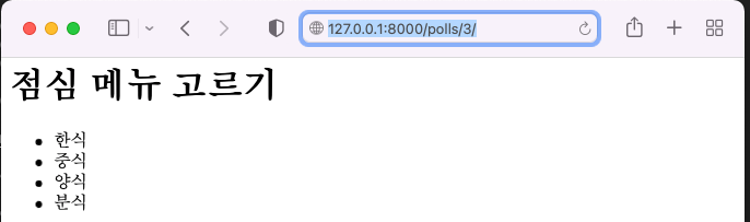 polls/templates/polls/detail.html 파일을 아래와 같이 만듭니다.