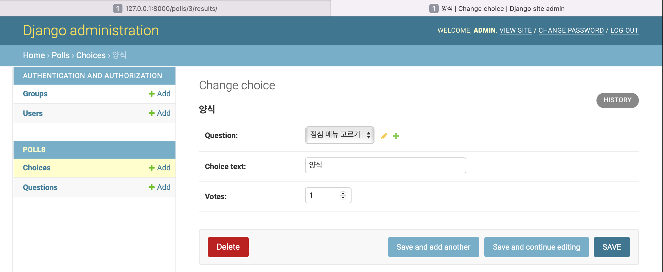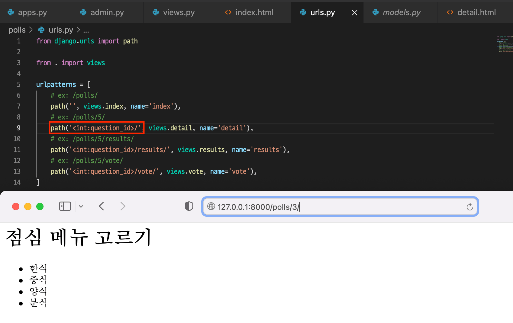 이제 polls/views.py 에서 아래 사항을 추가합니다.
