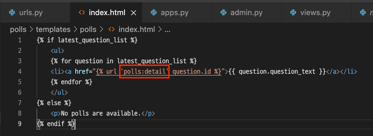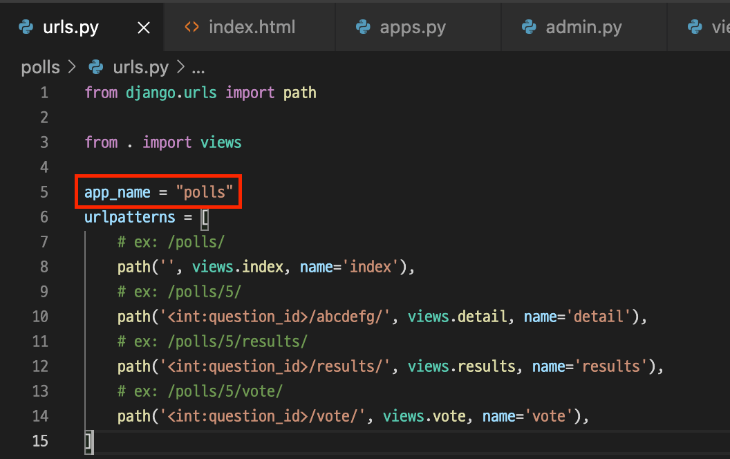 튜토리얼의 프로젝트는 polls라는 앱 하나만 가지고 진행했지만 실제 Django 프로젝트는 앱이 몇개라도 올 수 있습니다. Django는 이 앱들의 URL을 어떻게 구별해 낼까요? 예를 들어, polls 앱은 detail이라는 뷰를 가지고 있고, 동일한 프로젝트에 블로그를 위한 앱이 있을 수도 있습니다. Django가 {% url %} 템플릿태그를 사용할 때, 어떤 앱의 뷰에서 URL을 생성할지 알 수 있을까요?