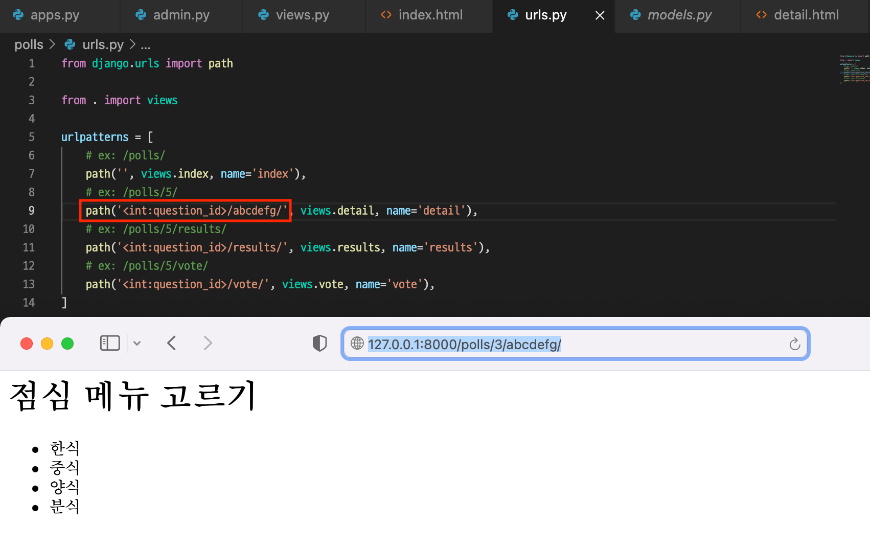 아래와 같이 바꿉니다. 그리고 urls.py에서 detail의 path를 변경해도 잘 접속되는지 확인해보겠습니다.