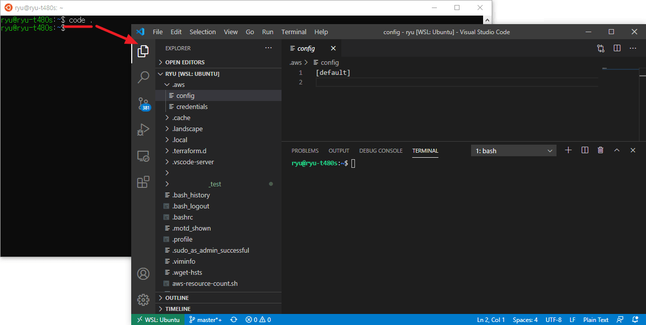 - 또는 Ubuntu에서 code . 을 입력하면 바로 VSCode를 Ubuntu로 실행 할수 있습니다.