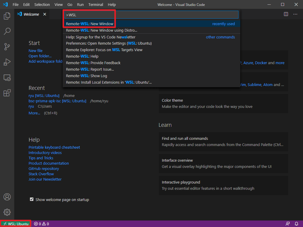 - 다시 VSCode로 돌아와 좌측하단 버튼을 클릭하거나 Ctrl + Shift + P 를 눌러 새로운 터미널에서 WSL을 검색하여 Remote-WSL: New Window를 선택하면 아래와 같이 Windows에 설치된 Ubuntu를 통해 터미널을 사용할 수 있습니다.